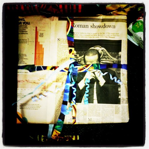 newspaper and I cut up a Trader Joes bag to make colorful ribbon. Just a few D.I.Y. gift