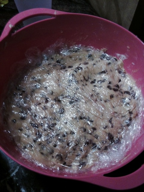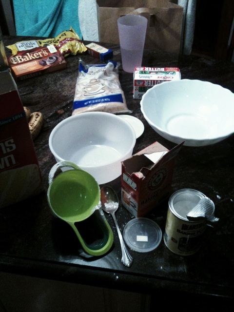 Chocolate time! The recipe actually calls for “bittersweet chocolate disks or fèves, at least 60 percent cacao content”, which Shaw’s didn’t have, so I used Nestle semisweet chips and Bakers unsweetened choco-cubes that I chopped up with a massive knife. Should be fine. Unless doves cry every time Mr. Chocolates recipe isn’t honored.