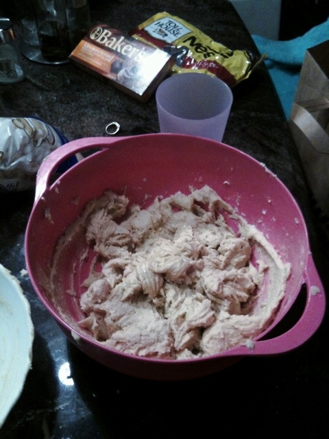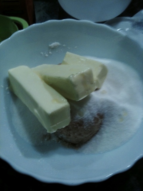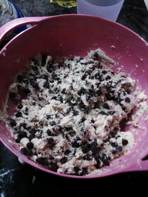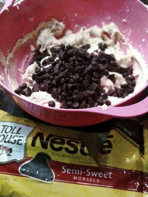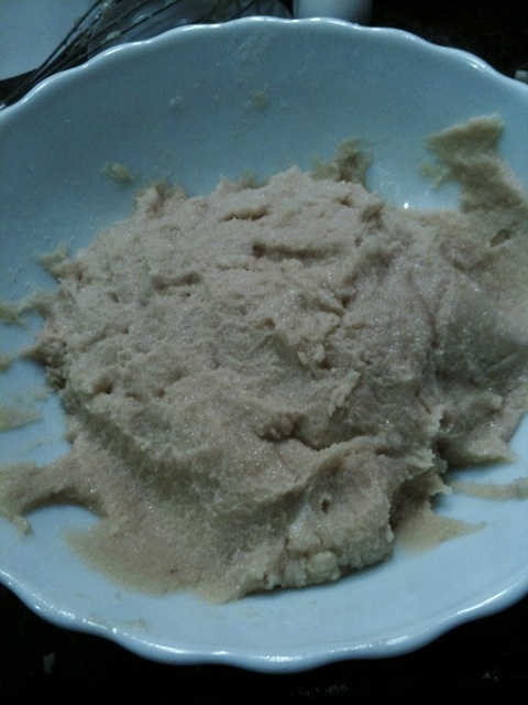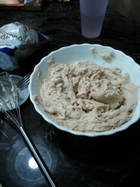 Here’s the thing. People who bake often have mechanically powered tools. I have a whisk. I couldn’t whisk the granulated sugar, brown sugar and butter. I attempted it but all the butter collected into the whisk. So I used my hands, which worked out well. Also it exfoliated my hands.