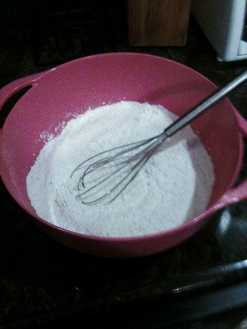 Now this is all the powdered stuff, cake flour, bread flour, baking soda, baking powder, salt. I used a whisk for this. Because I COULD. Back to this: