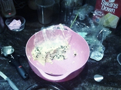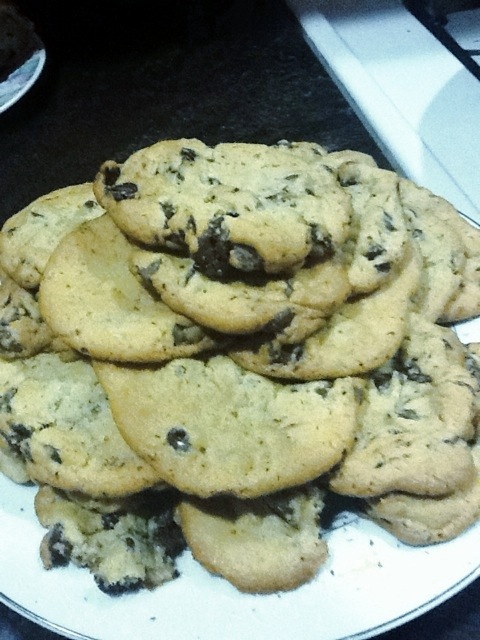 So, my dough has had time to chill out. I took an ice cream scoop to put them on a giant metal pan. Here’s the finished product: