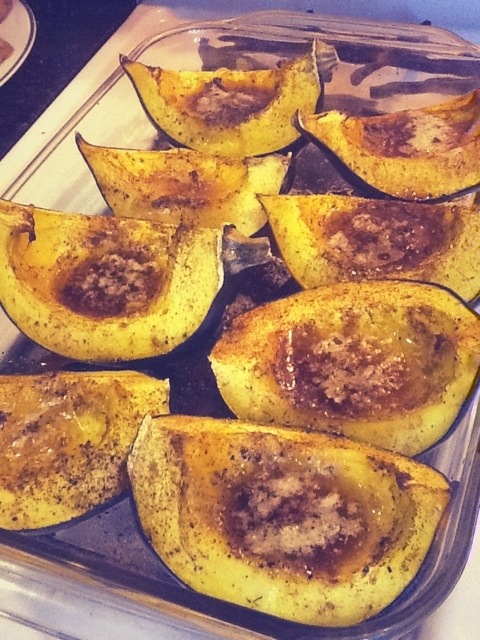 In case you want to make them too: Cut the acorn squash into quarters, put butter, cinnamon, brown sugar, black pepper, nutmeg and a single clove on each quarter. Put in oven for 40 minutes or until your fork sinks into the flesh with minimal trying. I loaded the butter on these a bit too much methinks…